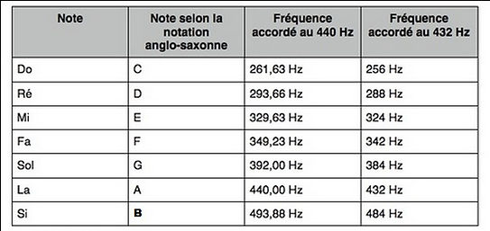 Fréquences des notes du piano, des diapasons etc... selon si vous les accordez en 440 ou en 432 Hz